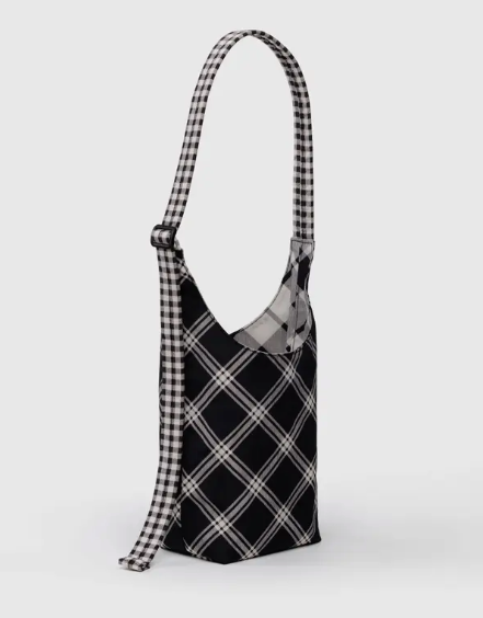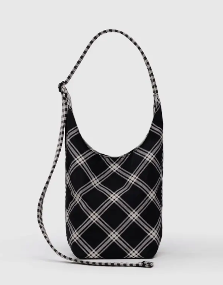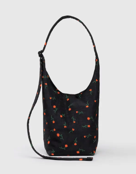 A slouchy, softly structured nylon bag with an adjustable strap. Interior zip pocket with a magnetic closure.
