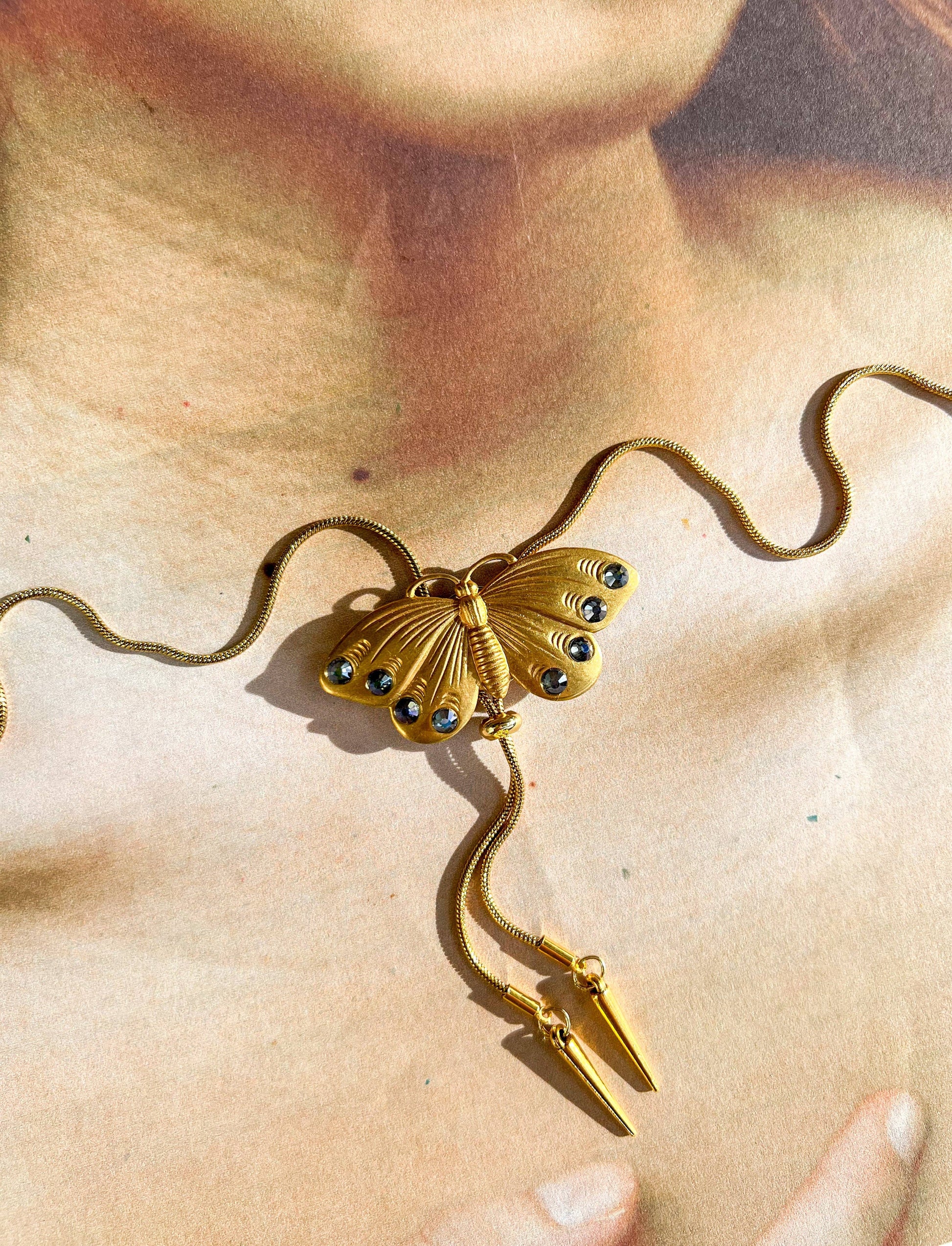 Vintage Style Butterfly Gem Bolo Tie Gold plated butterfly with 8 set Montana blue gems. The butterfly is on a gold plated metal snake chain and is adjusted by lightly pulling on the bead. The bead will slide up and down the chain to adjust the position of the butterfly. This is an art deco inspired bolo tie. Can be worn traditionally as a bolo tie or as a part of a stacking necklace set.