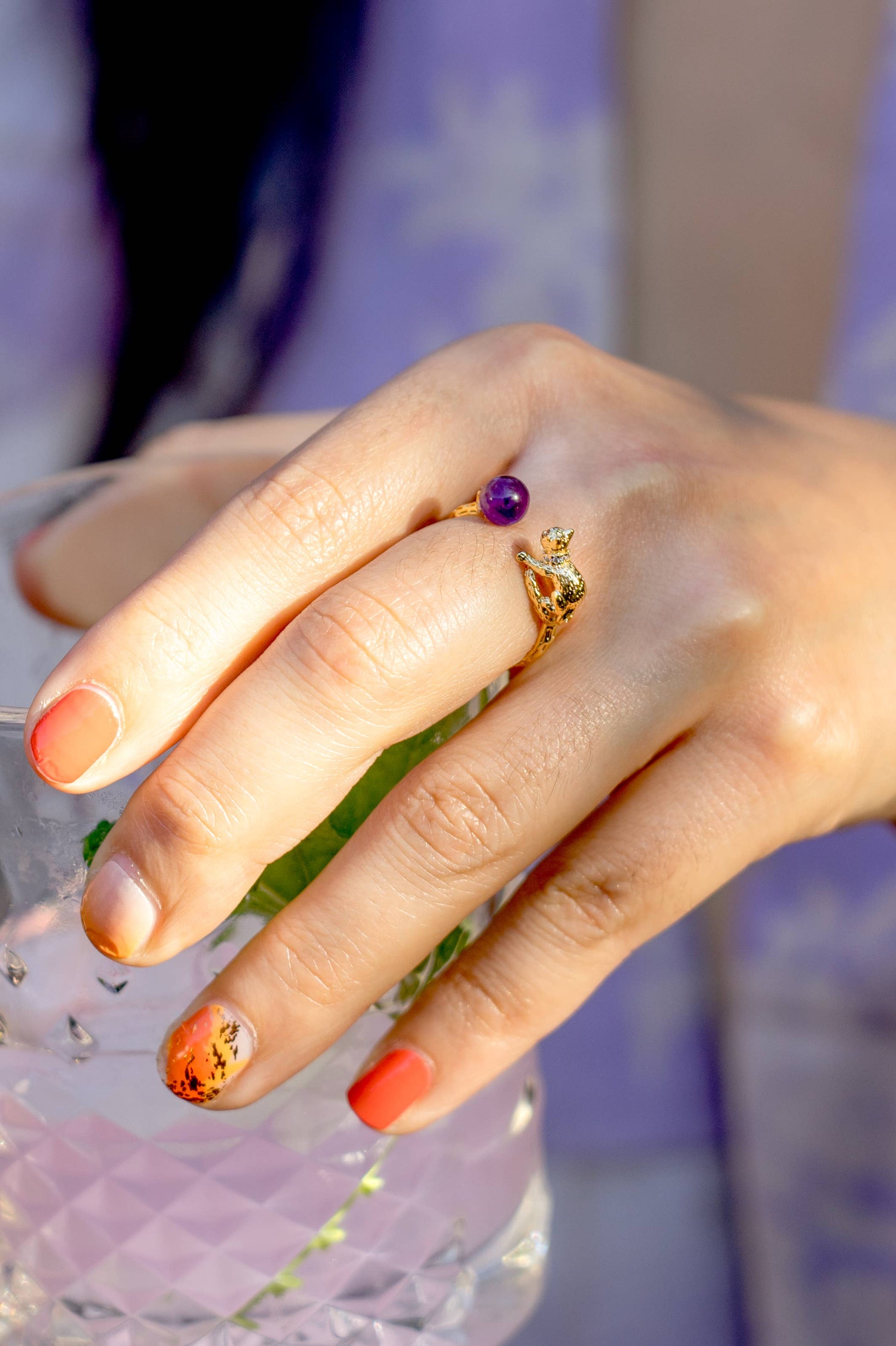 This lovable Cat's Cradle Ring is the purrrfect! Crafted with 18k gold plating and featuring an amethyst stone.