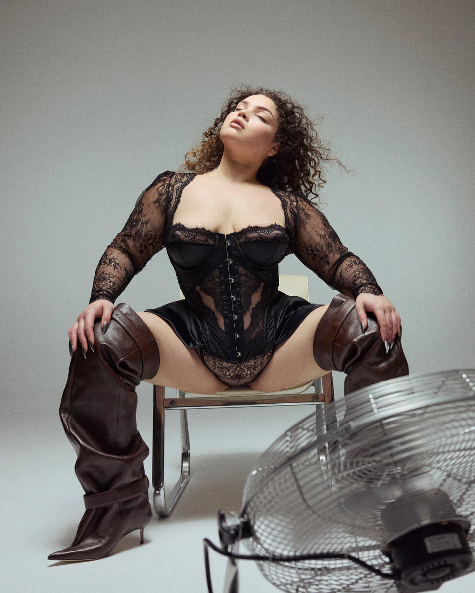 Luxurious lace and microfiber Corset with center front busk, sheer lace appliqué, seductive side flutters at hip, lace up back, and long lace sleeves.