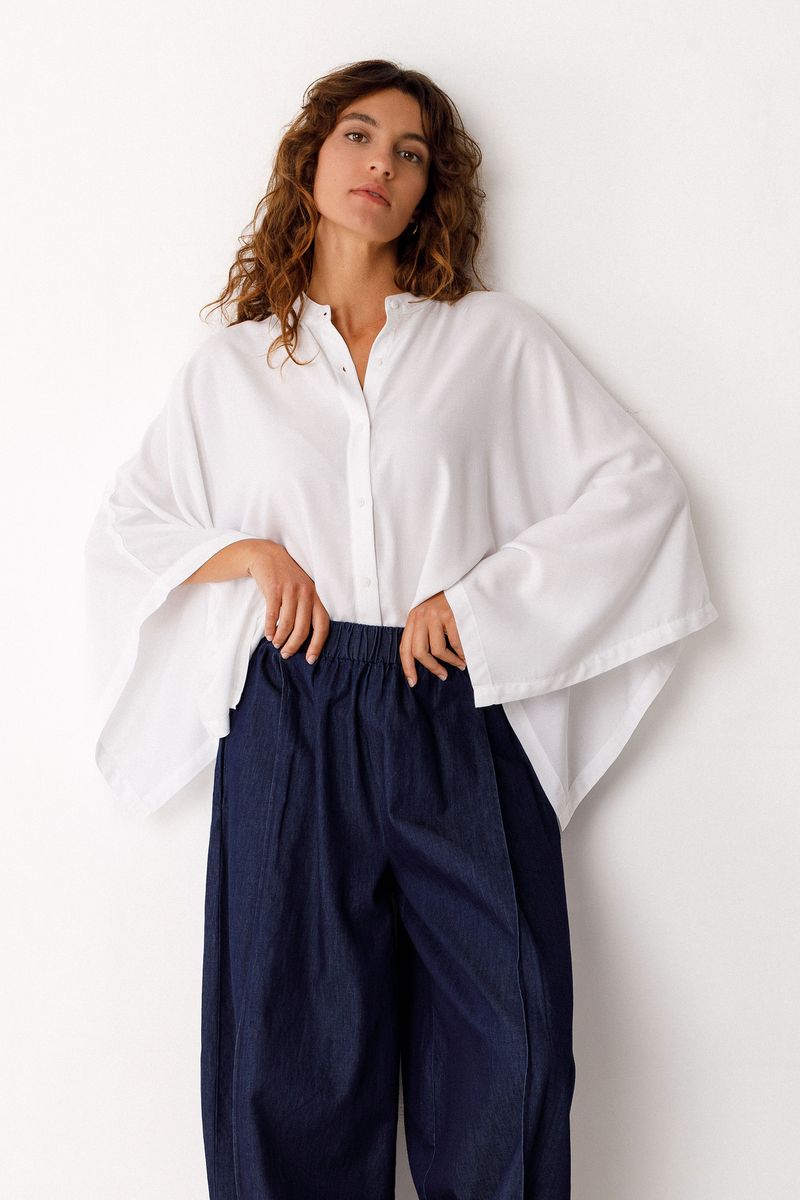 Oversized shirt with 3/4-length kimono sleeves, Mao collar and button closure at the front.