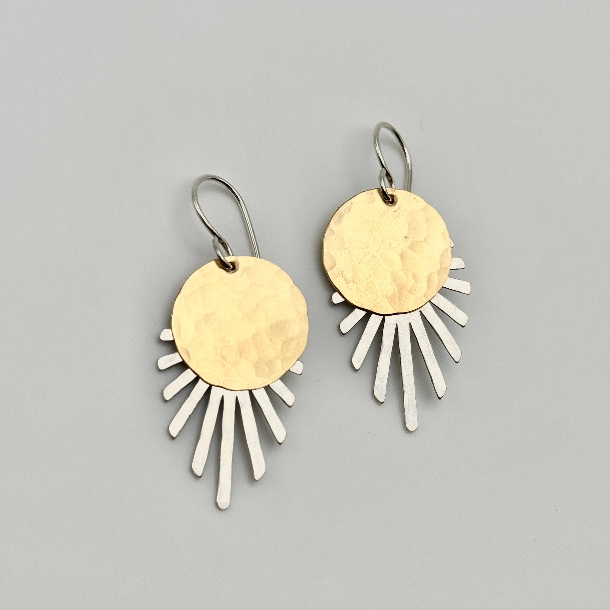 Textured discs hang over a textured burst. All hang from Sterling Silver or 14 karat Gold Fill ear wires.