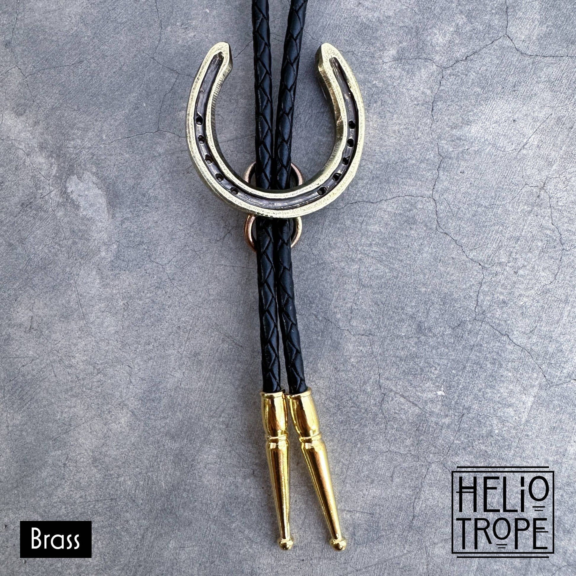 - Horseshoe measures 1.5” tall by 1.5” wide. Metal options: - Brass (gold-toned) - White Bronze (silver-toned) - Solid Sterling Silver All bolo tips are silver-plated or gold-plated base metal. Machine braided black,