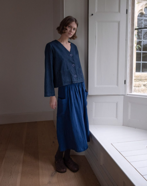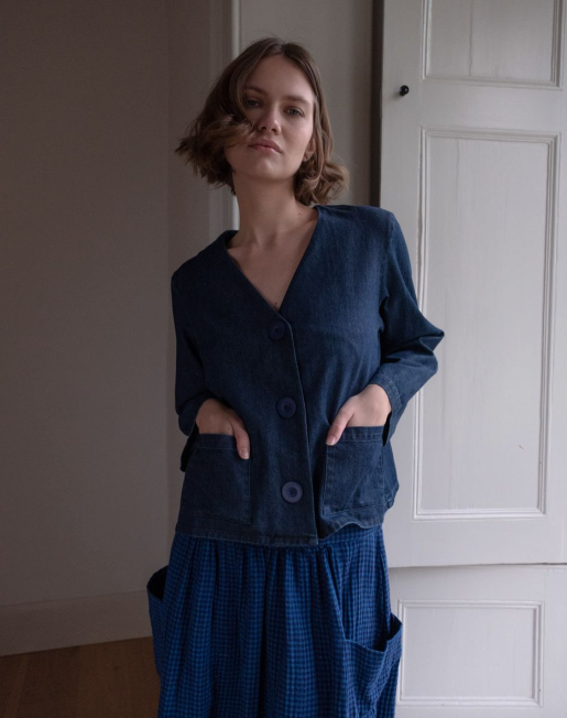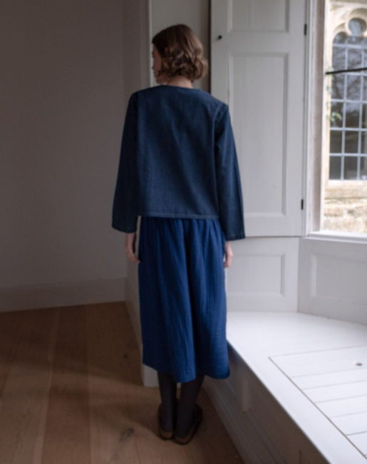 100% Cotton. This boxy jacket-style overshirt is a stylish way of adding an additional layer. It has the structure of a jacket but is soft and easy to move in. Wear it over one of our fine knits or with a woven top or blouse. It features large functional buttons and two convenient patch pockets. This one is made in a mid-weight blue denim and has been washed for softness and to bring out the detailing.