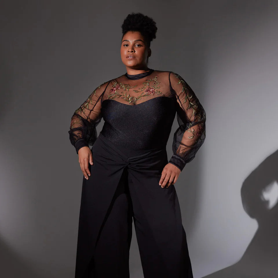 The Livia bodysuit features high neck embroidered tulle with lux center-back ribbon ties at your neck, billowed cuffed sleeves and snaps closure gusset opening.