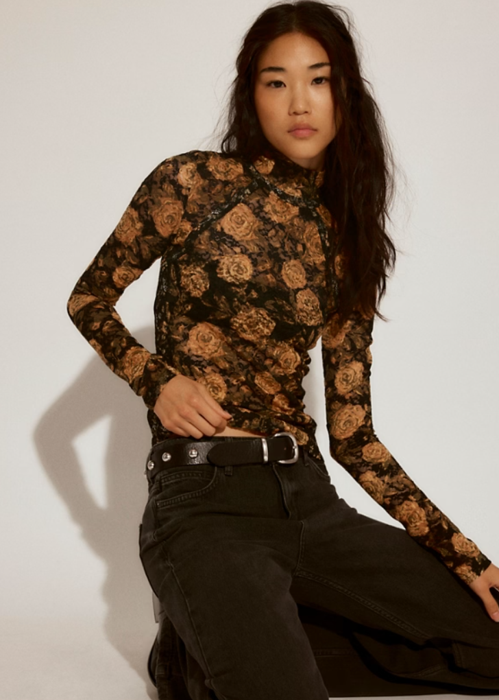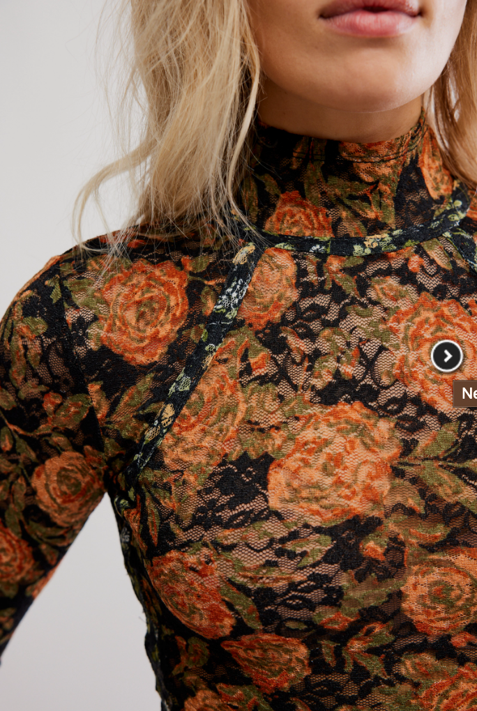 Your new favorite layering top has arrived–this long sleeve is featured in a statement printed lace with a turtle neckline and delicate keyhole detail.