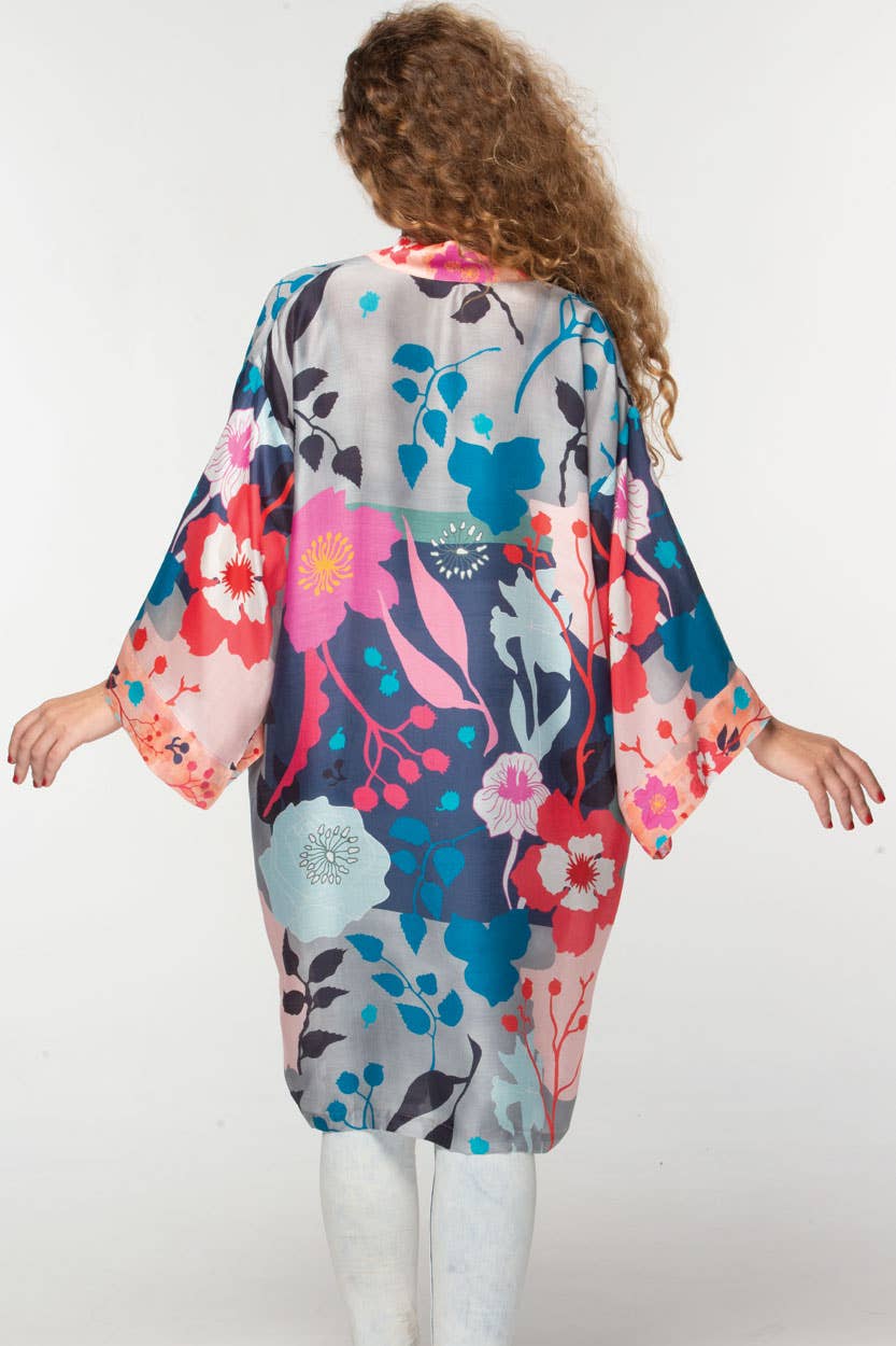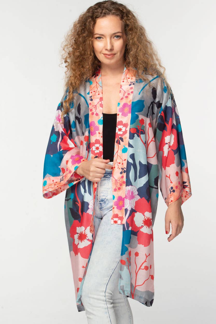 Our Malini Kimono is made with soft 100% cupro material, which is a luxurious, sustainable fabric that is produced from repurposed cotton waste in a closed loop system.