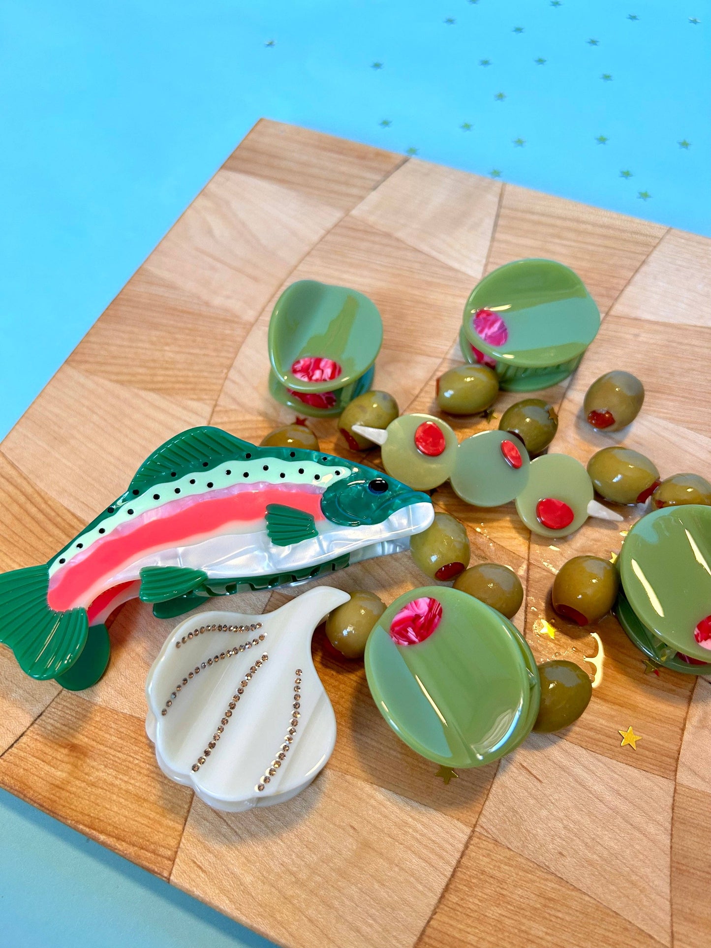 Women want it, fish fear it. It's the rainbow trout hair claw here to bring you some Bass Pro Shop Chic, complete with black rhinestone spots.