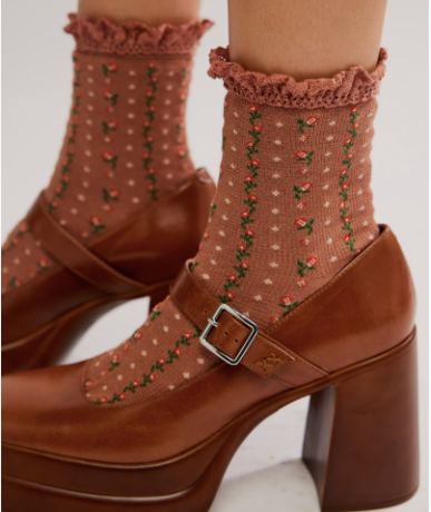 So perfect pair of socks featured in a waffle knit fabrication and crew-style with feminine floral detailing, dainty ruffled trim, and a seamed heel and toe.